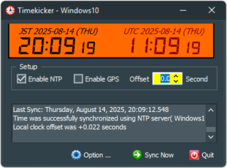 When connected to the Internet, Timekicker automatically synchronizes the computer’s clock with a time server (NTP server).